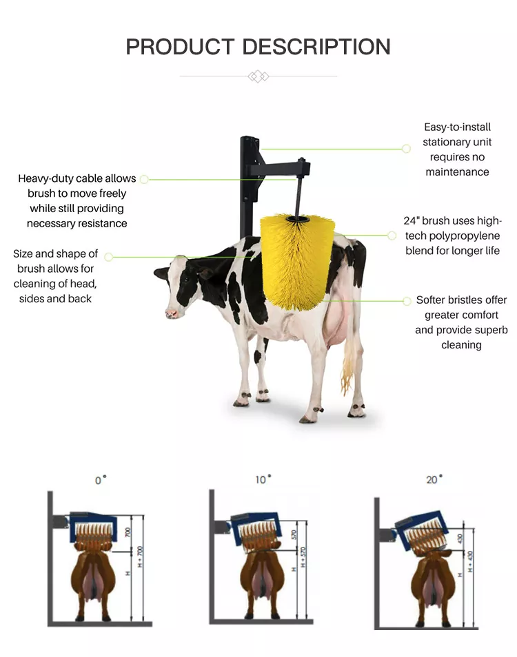 2. 0°/10°/20° चे समायोज्य कोन विविध आकारांच्या पशुधनाला अनुकूल करतात आणि डोके, बाजू आणि पाठ स्वच्छ करण्यास अनुमती देतात.